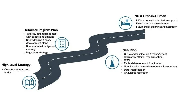 From discovery through IND, our expert team of seasoned biotech and pharma consultants delivers hands-on, flexible, and results-driven support to efficiently shepherd your program from late-stage discovery through nonclinical studies to first-in-human clinical trials.